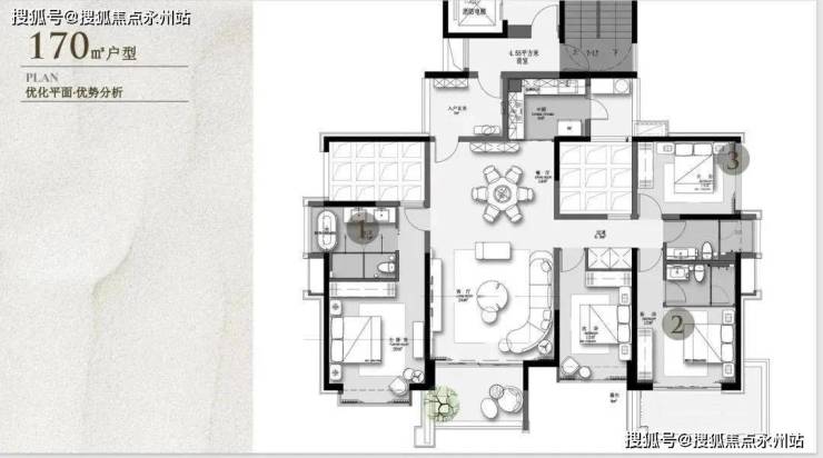建面约170㎡,原始结构是四房两厅三卫四阳台,奇数层客厅、主卧、厨房都有阳台,偶数层是主卧、次卧、厨房有阳台。奇数偶数层入户门的阳台可做玄关使用,餐厅左侧镂空处搭起来可做卧室,餐厅右侧搭起来可做书房或儿童房使用,最多可做5+1房使用,可塑性非常强