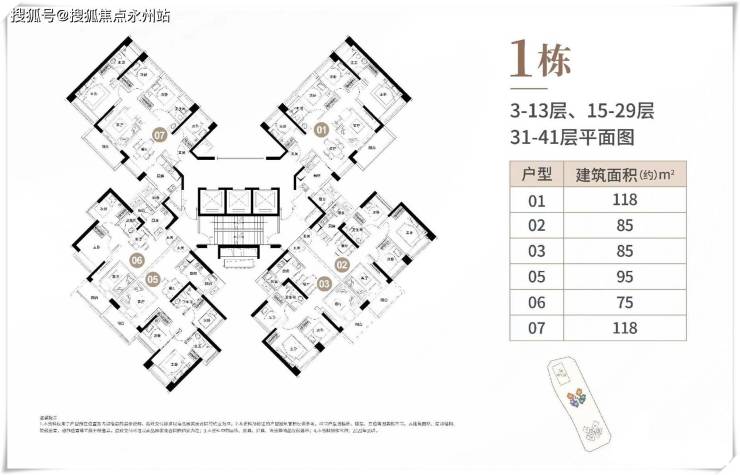 项目梯户比为3梯6户,所有户型的朝向均为东南或西南,户型分布如下图: