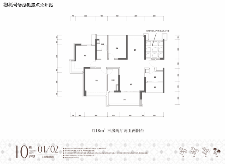 约118㎡三房两卫(10栋01/02户型)双龙抱珠格局,南北通透;奇数层厨房、客厅配有阳台,偶数层餐厅、主卧和厨房配有阳台