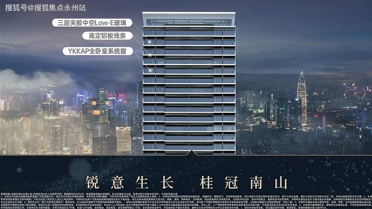 项目外立面采用玻璃幕墙、铝板线条与真石漆,甄选三层中空夹胶 Low-E 玻璃、铝板线条等高精用材,定制全卧室 YKKAP系统窗,以锐意向上的姿态勾勒“桂冠南山”之形,境呈立于北环大道之上的新生作品。