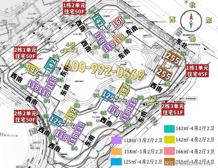 项目由5栋45-51层高的超高层住宅组成,具体分布为:1栋1单元4 层、1栋2单元50层、2栋1单元51层、2栋2单元50层、2栋3单元50层。整体规划982户,全部为商品房,无回迁房或保障房,居住圈层纯粹。在梯户比设计上,1栋1单元采用2梯2户的楼王配置,其余楼栋均为4梯5户设计,地下室设有4层,规划1500个车位,车位比达到约 1:1.53。