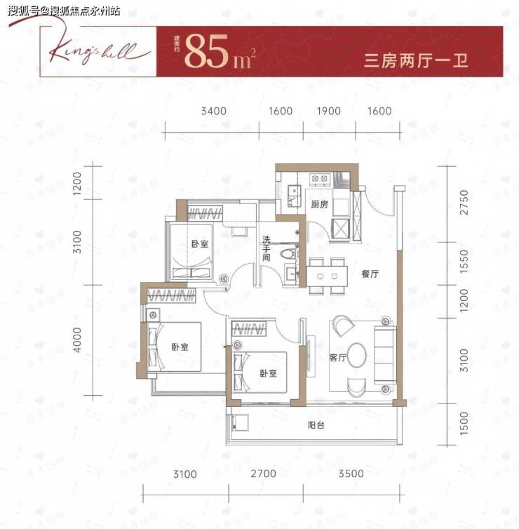 80-85㎡:紧凑三房,竖厅设计,主卧带飘窗,适合首次置业家庭。