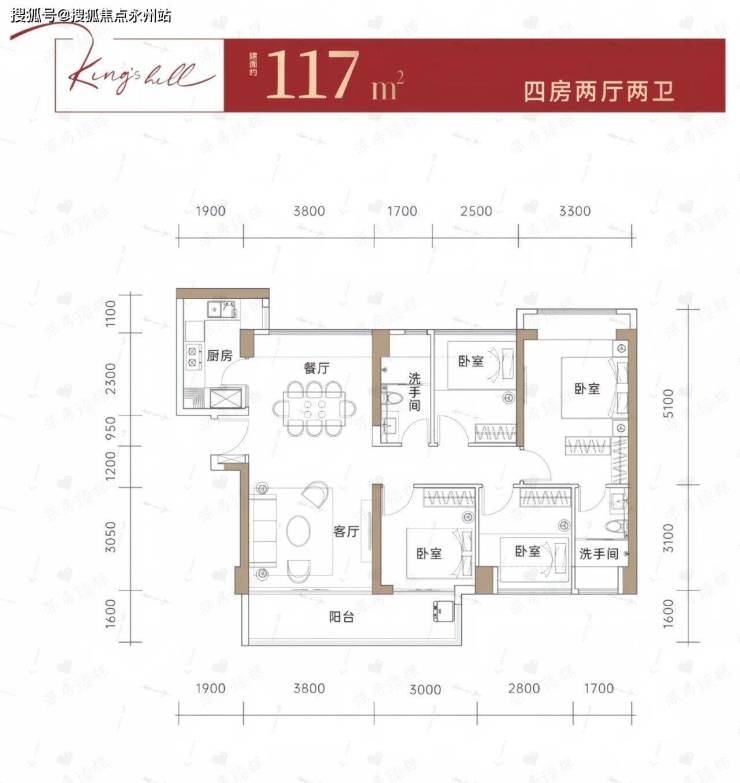 116-119㎡:阔绰四房,南北通透,客厅开间4米,主卧3.5米宽度,L 型厨房配独立家政间。