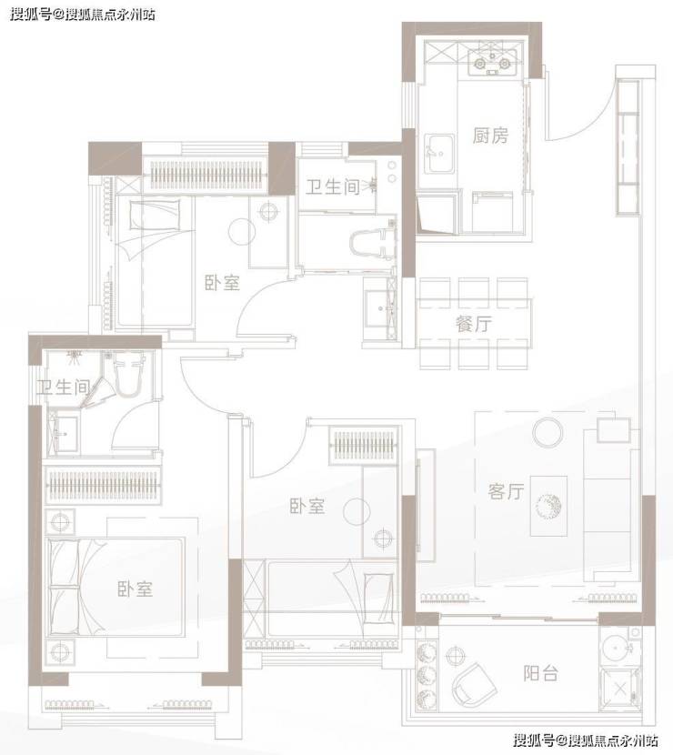此外,该户型的L型厨房多元功能合理配置,三卧室均带飘窗,大大提高了空间利用率