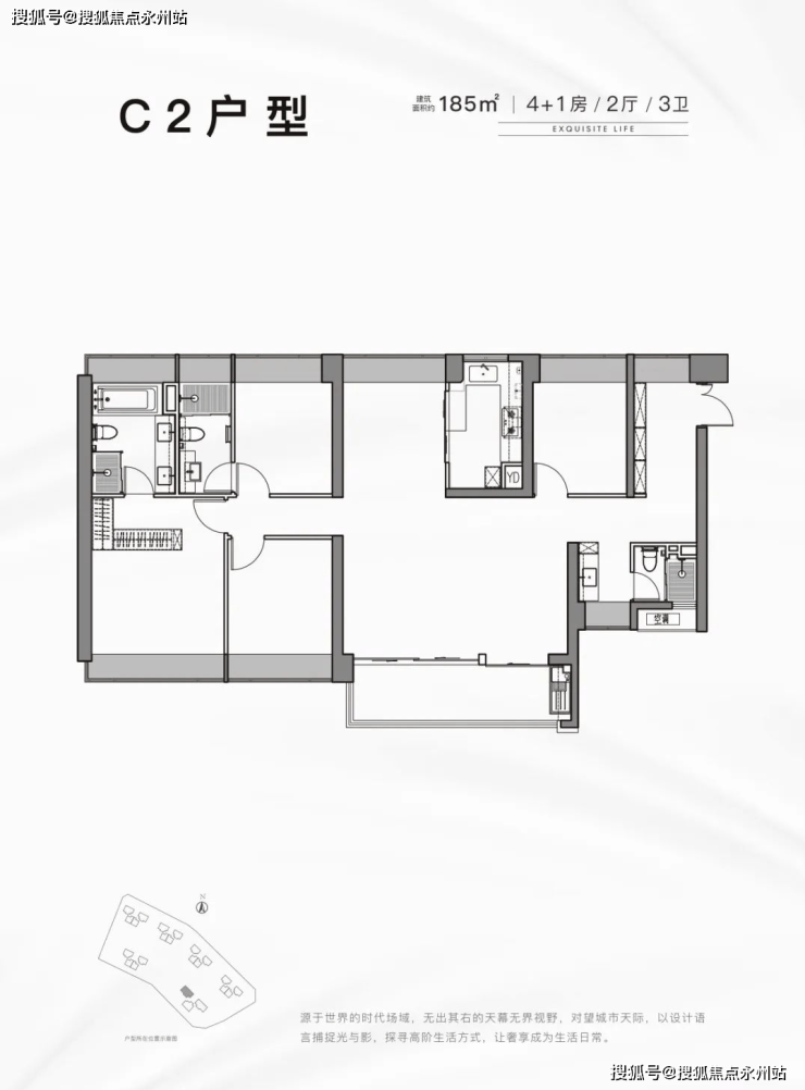 185㎡的4房2厅3卫,楼王单位,3梯3户,设计的是横南北通透格局,餐客厅一体化,三开间朝南,设计有2个独立套房,L型厨房,得房率:77.44%(不含赠送),阳台主朝西南向。