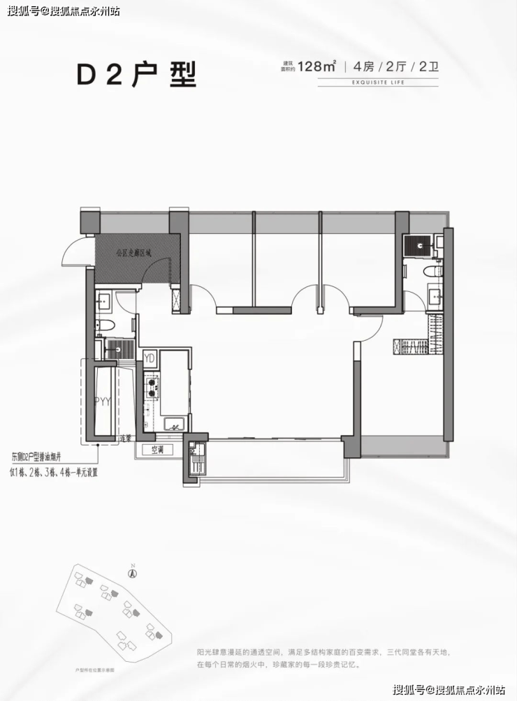 128㎡的4房2厅2卫,设计的是横厅南北通透格局,餐客厅一体化,全屋飘窗设计,进门还赠送有一大片的私用空间,也是小区内赠送面积最多的户型,L型厨房,得房率:70.33%(不含赠送),阳台主朝西南向。