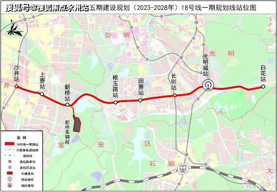 18号地铁线,这是一条东西向的地铁线路,规划串联宝安海洋新城、光明城、观澜、平湖金融城,全长61.6公里,设站27座,其中一期工程沙井站-白花站,设站8座,全部为地下站,设计时速120公里,