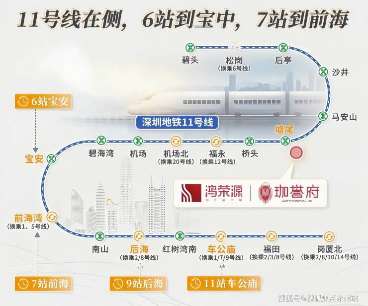 项目距离11号线塘尾站步行仅300米,11号线作为深圳西部快线,30分钟内可覆盖深圳南山、福田、宝安等核心区域,通勤效率拉满。