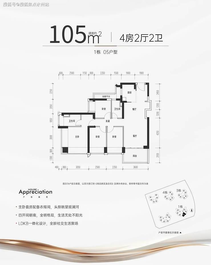 105平4房2卫:4开间约12m,全东南向采光,视野开阔大套房主卧180度环幕采光景观S型墙体设计冰箱位,使用空间利用更合理客餐厅一体化设计,空间利用更高效,家人间互动交流感更强。全部东南朝向窗外观澜河、碧道公园、大布巷历史文化公园。