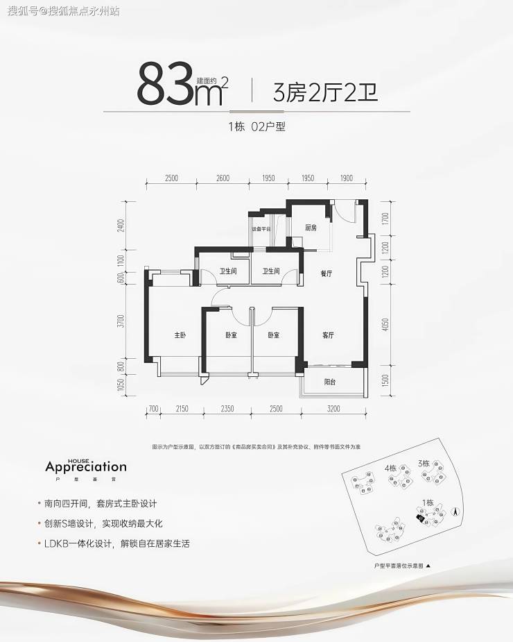 83平3房2卫:4开间东南向采光,赏碧道公园、看园林景观主卧室通透双面采光,收纳更轻松S型墙体设计冰箱位,空间利用更合理2个卫生间方正格局,有飘窗更省空间,全部西南朝向,看大城景观4开间西南采光,全屋通透。