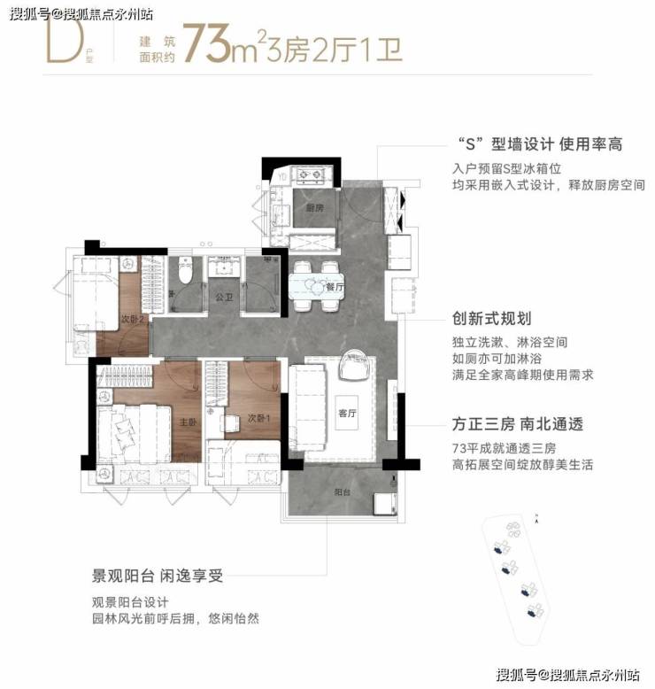 极致紧凑三房:深圳罕见的73㎡三房设计,三开间朝南,客厅3.1米开间搭配竖厅格局,空间通透不压抑。