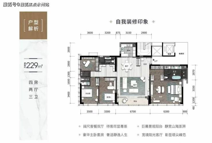 公寓229㎡4房2厅3卫:3.3米层高,6.7米客厅开间,舒适度高,配置较多落地窗,视野通透,空间敞亮感十足,可享受三重景观:山景、海景、城市景观,主卧大套房设计,十分奢华,户型灵动可变,实用型4房可变享受型双主卧3房