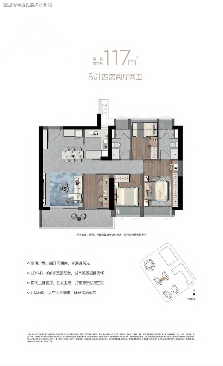 117㎡的4房2厅2卫,设计的是竖厅格局,LDK+B一体化,四开间朝南,主卧套房设计,U型厨房,6米长的大阳台,东南朝向。