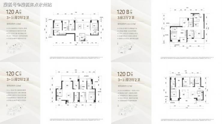 C 户型(120㎡):横厅南北通透,客餐厅 6 米开间,四卧室均带飘窗,主卧 17.65㎡,西北朝向,可俯瞰深大校区。