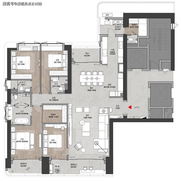 建面约270㎡海景阔宅 4房+1工人房+4卫 (01/02) 双梯独立电梯厅入户,出入尊崇 ·层高约3.5米,远超市面标准,挑战空间上限 ·客餐厅直连双阳台,进深约11m,多重阳台,南北通透 ·南向主阳台开间长约9米,270°环幕视界 ·漫赏湾海的波光粼粼,俯瞰红树林的连绵绿意 ·可开可合中西餐厨、岛台设计,国际化奢尚体验 ·进深约5.7m奢华主卧,享独立大衣帽间