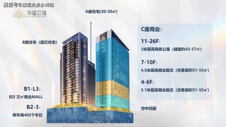 C座则高26层,其4至9层为商业空间,10至26层设有51至64平方米的商办公寓。