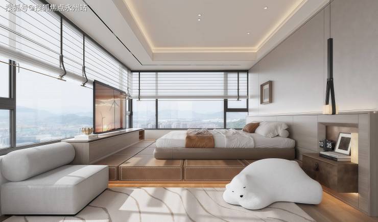 落地飘窗设计:全屋次卧尺度宜人,落地飘窗给予空间更大灵活度,三代家庭成员各自有独立天地。