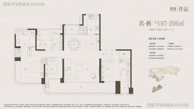 197㎡大平层:单价4.93-6.39万/㎡,总价973-1262万,专梯专户设计,南北双阳台,北向观山、南向瞰城。
