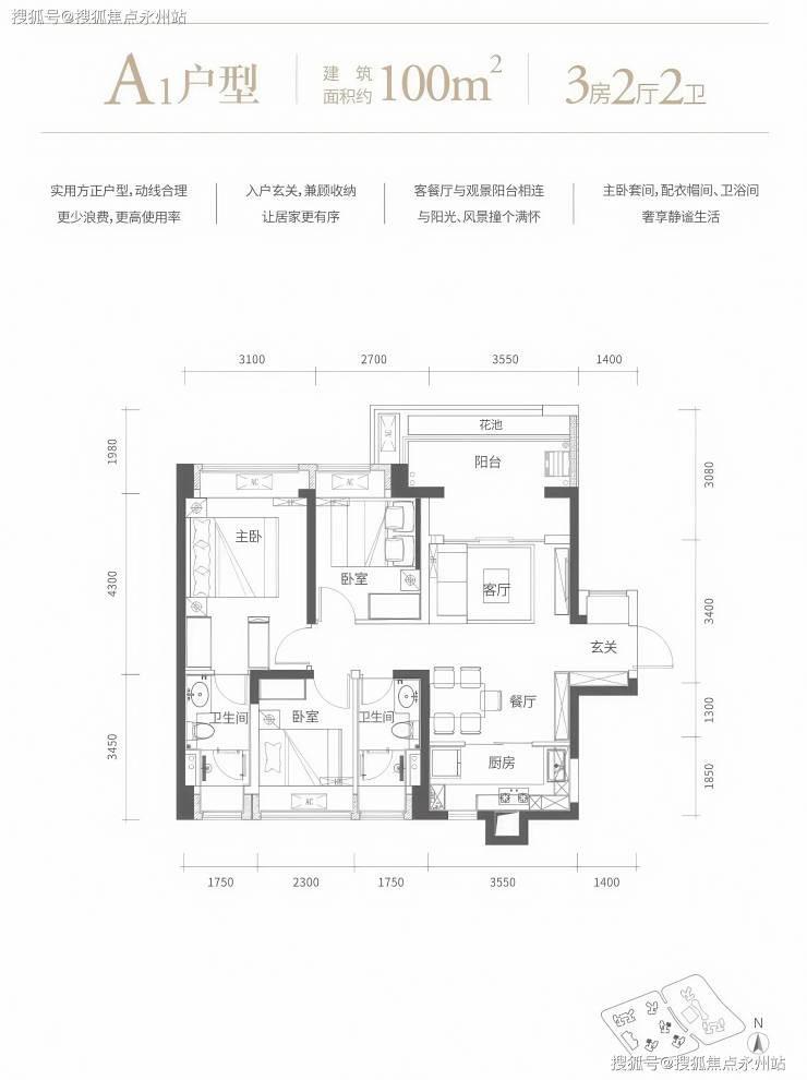 100㎡的3房2厅2卫,A1户型,设计的是竖厅格局,客厅3.55米开间,进门玄关,LDKB一体化设计,动静分区,L型厨房,卫生间干湿分离,阳台主朝西北向。
