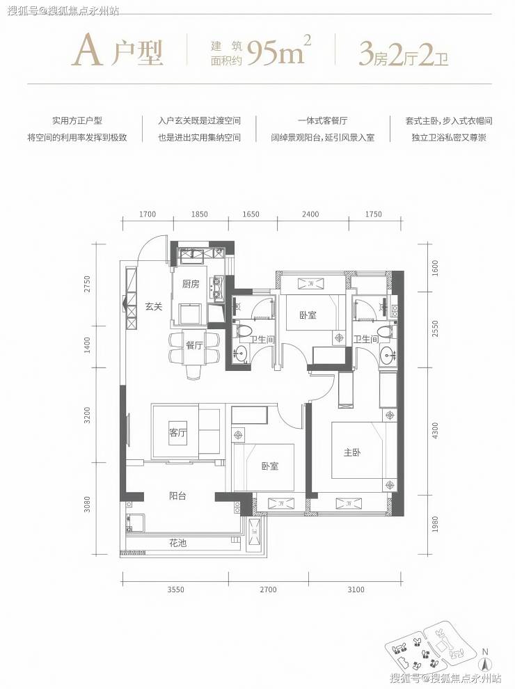 95㎡的3房2厅2卫,设计的是经典竖厅格局,客厅3.55米开间,进门玄关,LDKB一体化设计,动静分区,三开间朝南,L型厨房,卫生间干湿分离,东南、西南或正南朝向。