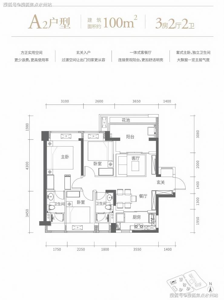 100㎡的3房2厅2卫,A2户型,设计的是竖厅格局,客厅3.65米开间,进门玄关,LDKB一体化设计,动静分区,L型厨房,卫生间干湿分离,阳台主朝东北向。