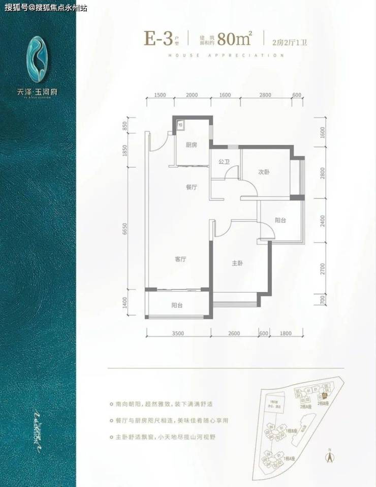 E2户型-80㎡-3房2厅1卫,2栋A座05户型,设计的是竖厅格局,客厅3.5米开间,餐客厅一体化,3个房间宽度分别为3.15/2.4/2.2米,L型厨房,得房率:83.7%(包含赠送),阳台进深1.5米,朝西南向。
