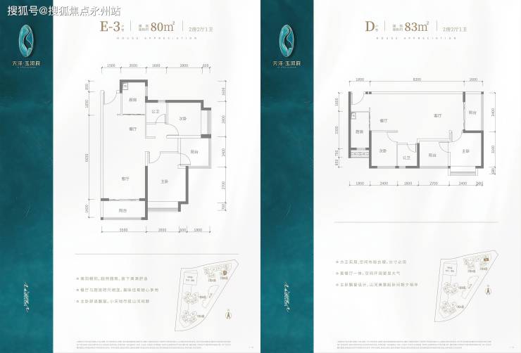E1/E2户型(80㎡):西南向,阳台朝西,得房率83.7%-84.3%