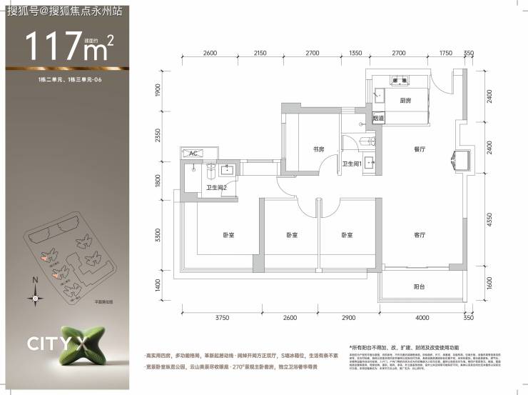 改善优选:117㎡四房(总价509万起),横厅设计+大阳台,适合对空间尺度有要求的家庭,高楼层房源景观溢价约5%