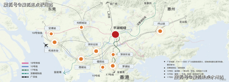 在远程规划中有17号线二期“鹅公岭站”就在项目附近,目前可以去到距离约3公里外的平湖枢纽站,在《深圳市轨道交通线网规划2016-2035年》远期规划中,平湖枢纽将汇聚10号/17号/18号地铁线,以及深惠城际,厦深铁路,广深铁路等多条主干线,将平湖枢纽定位为四主五辅中的“五辅”枢纽之一。