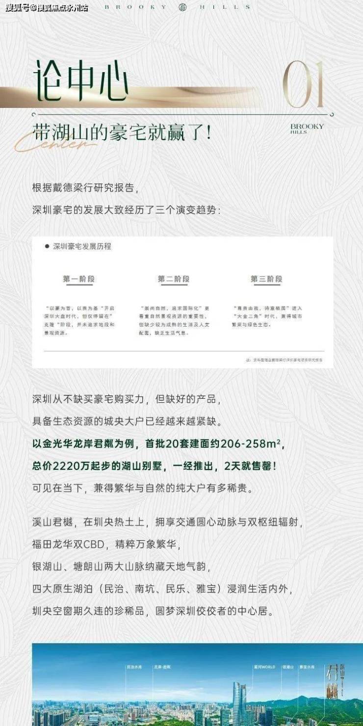 2022年厚积薄发,巅峰再续,金光华依托区域的商户资源,建造多个低密豪宅项目,以溪山·君樾、龙岸·君粼项目为蓝本,联动片区内金光华储备用地形成大区域开发,构筑总建面逾150万㎡的全新人居版图——金光华圳央墅区。