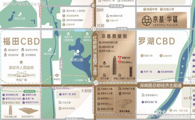 京基华樾周边有4条地铁线,距离3/9号线红岭地铁站约700米,9号线园岭站约1公里;17号线大塘龙站约1.1公里;1/3号线老街站约1.2公里。陆路,深南大道、滨河大道、红岭中路、宝安南路等