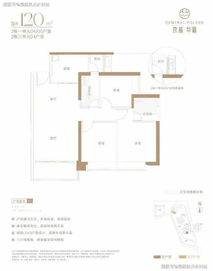 120㎡的3房2厅2卫,设计的是经典竖厅格局,LDKB一体化,动静分区,三开间朝南,L型厨房,还带1个小生活阳台,卫生间干湿分离,得房率约73%(不含赠送),阳台西南朝向。