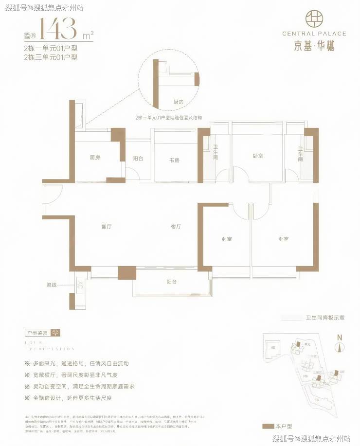 143㎡的4房2厅2卫,设计的是横厅南北通透格局,餐客厅一体化,四开间朝南,全屋飘窗,U型厨房,还带1个小生活阳台,卫生间干湿分离,得房率约73%(不含赠送),阳台主朝东南向。