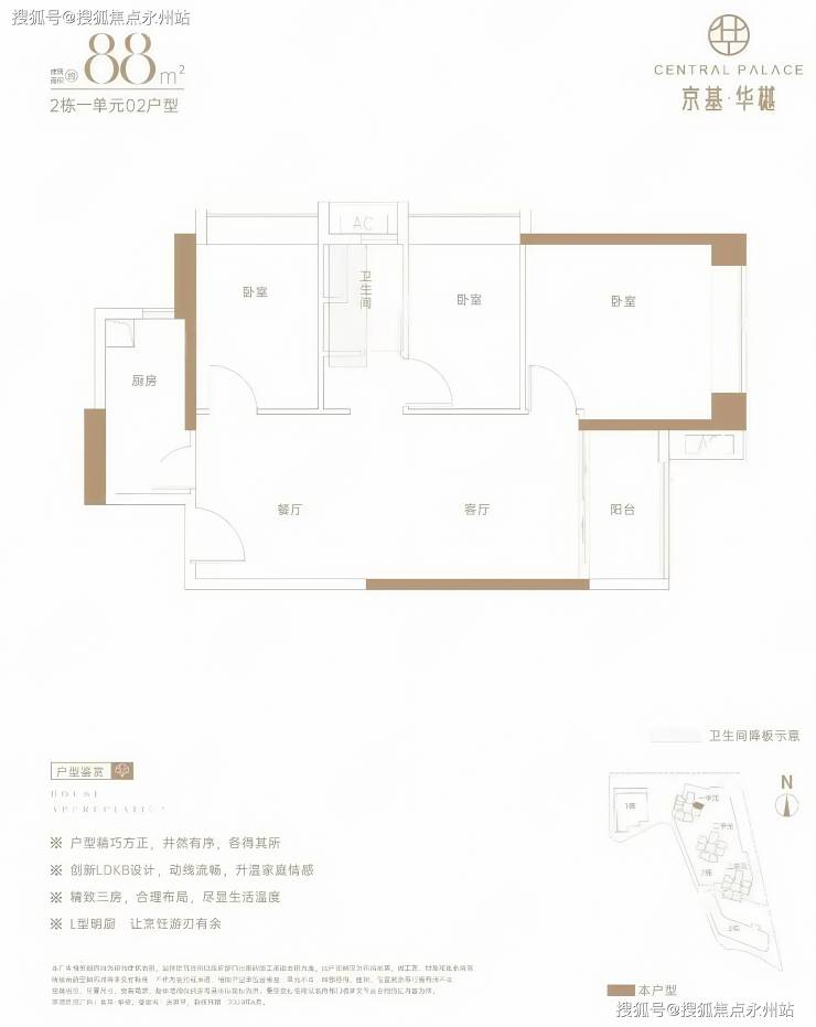 88㎡的3房2厅1卫,设计的是竖厅格局,LDKB一体化设计,L型厨房,卫生间干湿分离,得房率约73%(不含赠送),阳台朝东南向。