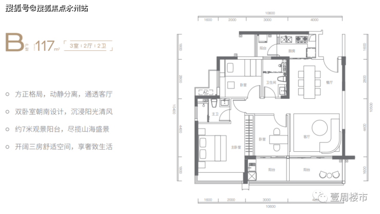 建面约117㎡三房两厅两卫,8米宽景阳台,户型方正,采光通透,双卧室朝南设计,主卧带3.6m宽景飘窗。同时,客厅与次卧阳台连通,宽度达约7m,一线瞰海采光无比舒适!
