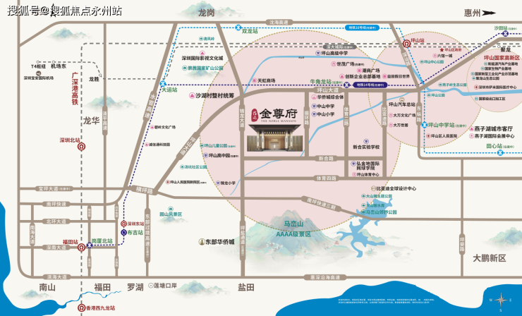 迅捷通道:坪盐通道(已通车)约10分钟可达盐田,约20分钟可达罗湖,约30分钟可达福田。