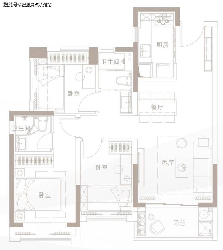 面积:79-85㎡3房1卫,91-95㎡3房 2卫,125㎡4房2卫