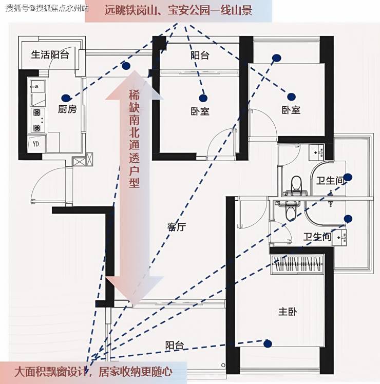 稀缺三阳台:客厅带约2.1米进深大阳台,餐厅衔接约4.3㎡生活阳台,次卧2.8米开间阳台。