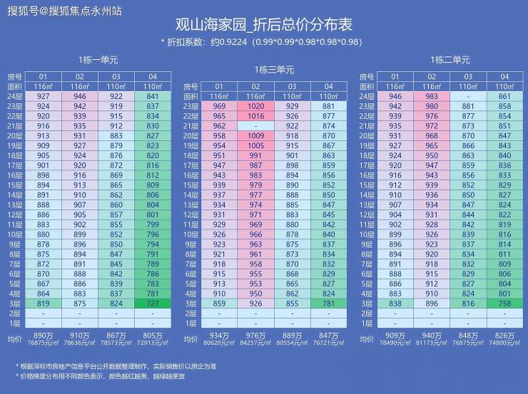 1栋1-3单元尚有少量房源,110平方米户型折后总价818-938万,115平方米户型901-978万。