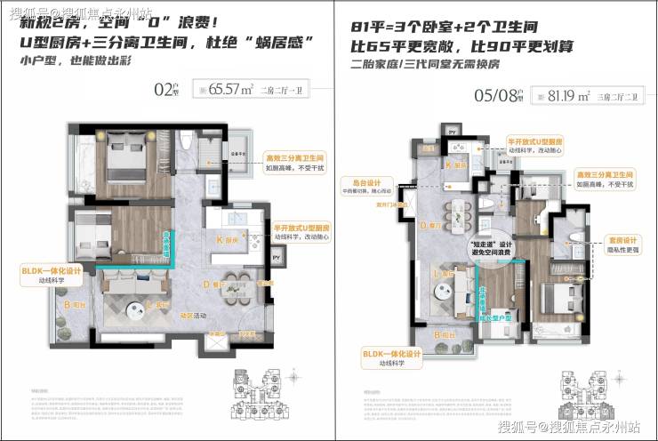 项目主推建面约65-81㎡的2-3房产品,均为新规后设计,得房率高达88%-91%(含赠送面积),具体分布如下: