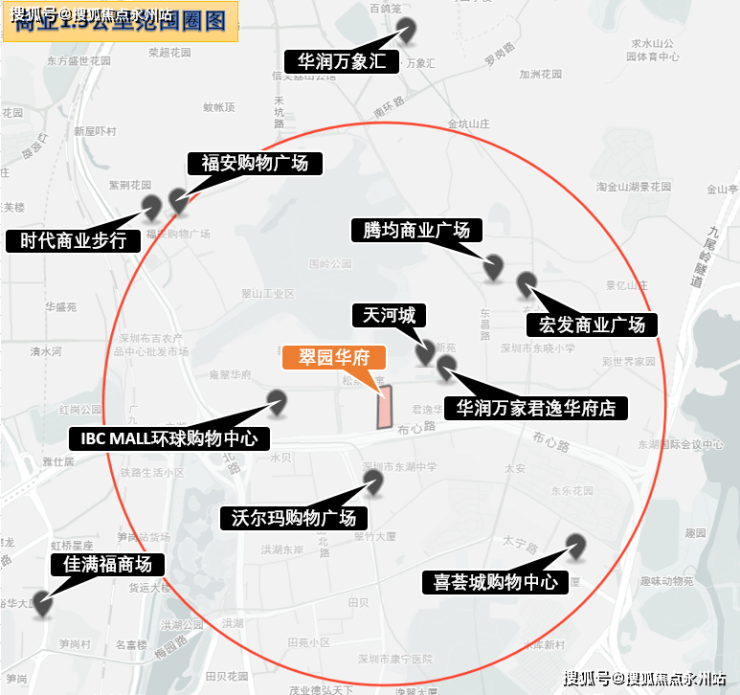 除以上商业外,据不完全统计,项目1.5公里范围内覆盖有5个大型集中式购物中心-粤海城约12万㎡天河城商业,IBC MALL(环球购物中心)、沃尔玛购物广场、喜荟城购物中心、福安购物广场;3个传统购物街区-宏发商业广场、腾均商业广场、时代商业步行街等。