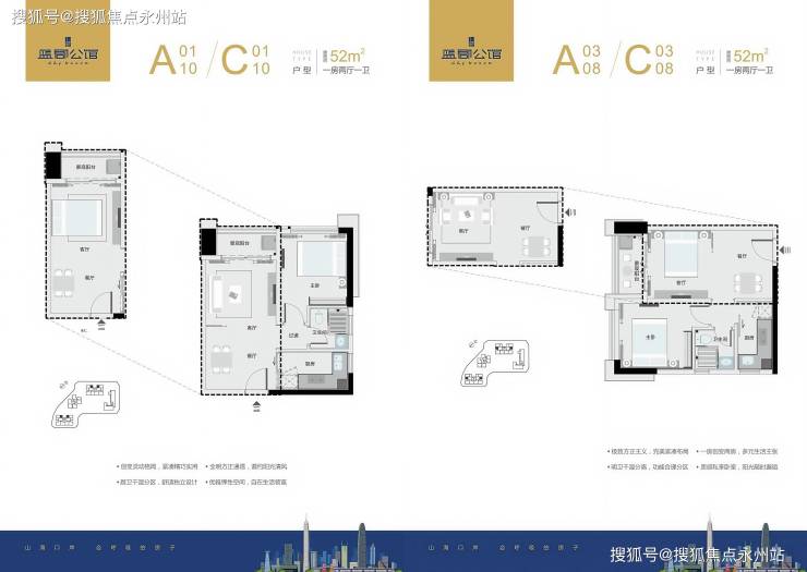建面52㎡1房2厅1卫(A/C 栋):户型方正紧凑,功能分区明确,玄关、厨房、卫生间、客厅、卧室一体化设计,空间利用率高。明厨明卫,干湿分离,厨房带独立窗户,避免油烟干扰。