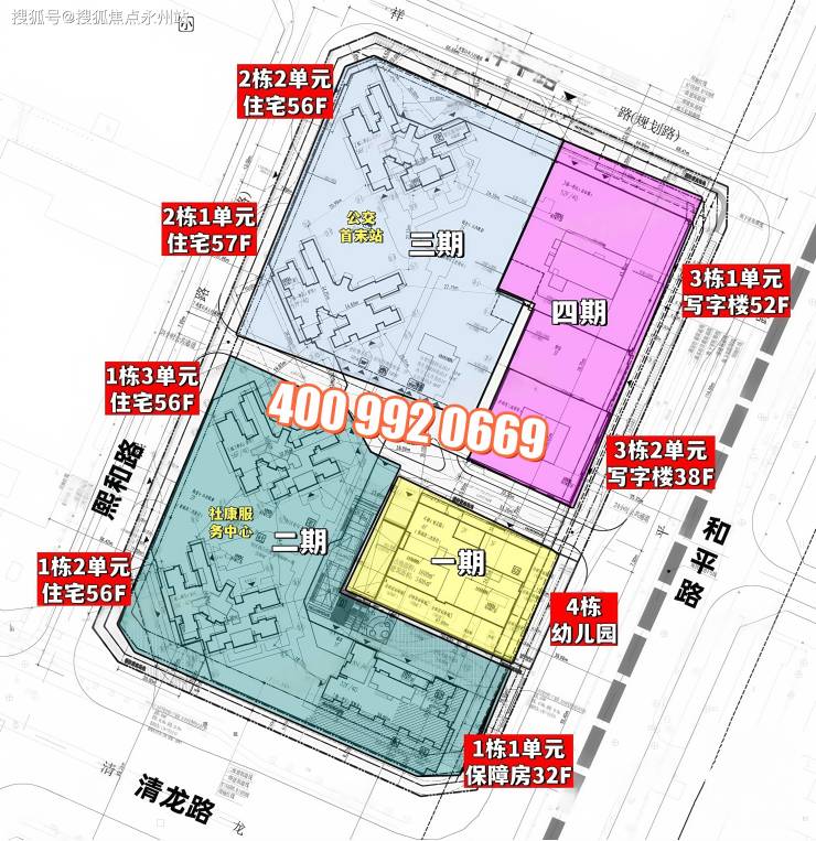 该项目共分4期开发,其中一期建设幼儿园,二三期建设住宅,总高56-57层的商品房,四期建设写字楼,总高38-52层,配建有公交首末站+社康服务中心+托育机构。