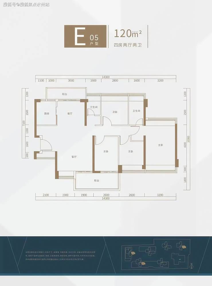 E-05户型为120㎡4房2厅2卫:该户型与G-05相似,南北通透,客餐厅独立,双阳台,多飘窗