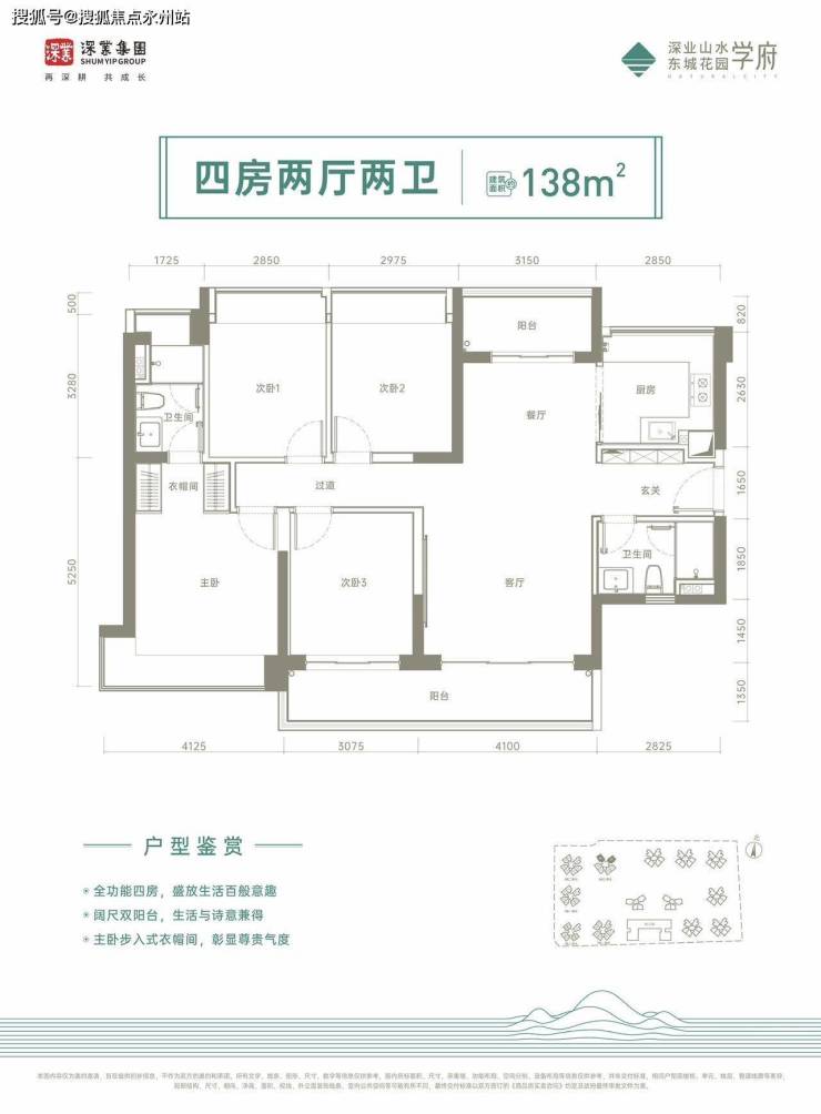 138㎡的4房2厅2卫,设计的是竖厅南北通透格局,进门入户玄关,南北通透双阳台,4个卧室,主卧大套间设计,客厅连接次卧出7.17米长的大阳台,U型厨房,卫生间干湿分离,阳台主朝西南或东南向。