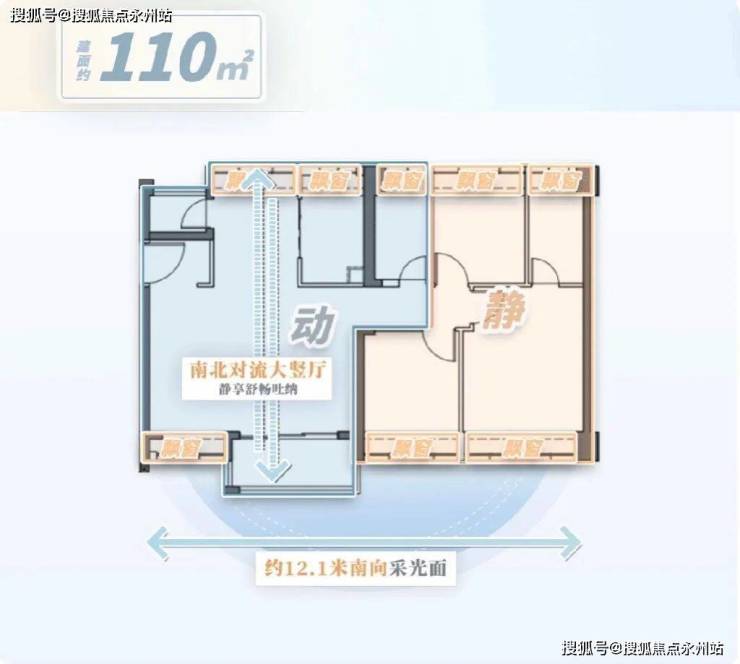 双阳台+8个飘窗的配置,阳光跑进屋子开Party,一侧的采光面就能达到约12.1米。