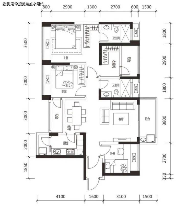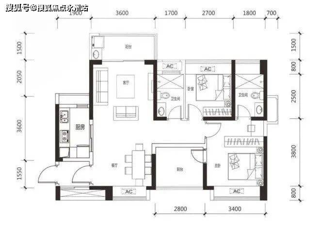 95平3房2厅2卫 :位于1A,1C,3B,3C座