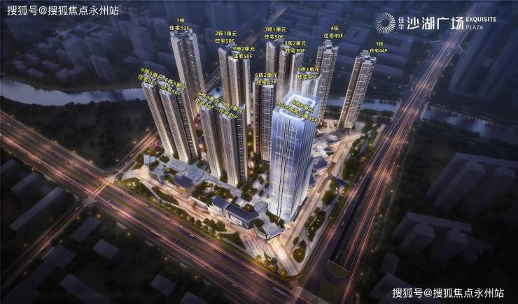 佳华沙湖广场,由佳华集团操盘,总占地面积约8.17万㎡,总建筑面积约62.2万㎡,计容建筑面积约42.6万㎡,容积率5.21,绿化率30%,共由6栋14个单元总高44-52F的住宅组成,其中1栋回迁房52F,2栋1/2单元回迁房50F,3栋1/2单元商品房50F,4栋商品房49F,5栋商品房44F,6栋1/3单元商品房46F,6栋2单元商品房47F,6栋4/5/6单元回迁房46F,6栋7单元办公+商务公寓45F,7栋规划1所幼儿园。