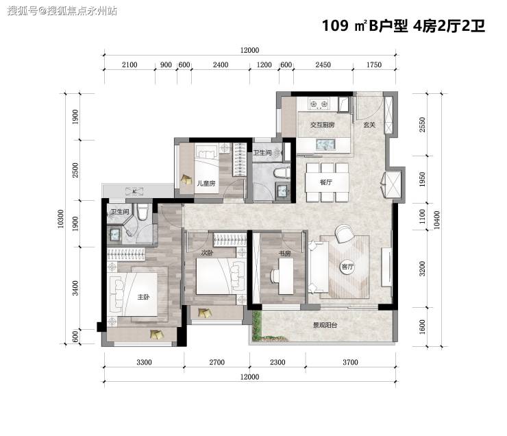 建面约109㎡B户型4房2厅2卫:四面宽朝南,超宽采光面,交互厨房,约24㎡宽敞客餐厅,约6米面宽景观阳台,多功能设计空间,可灵动百变做到每个空间利用到极致。