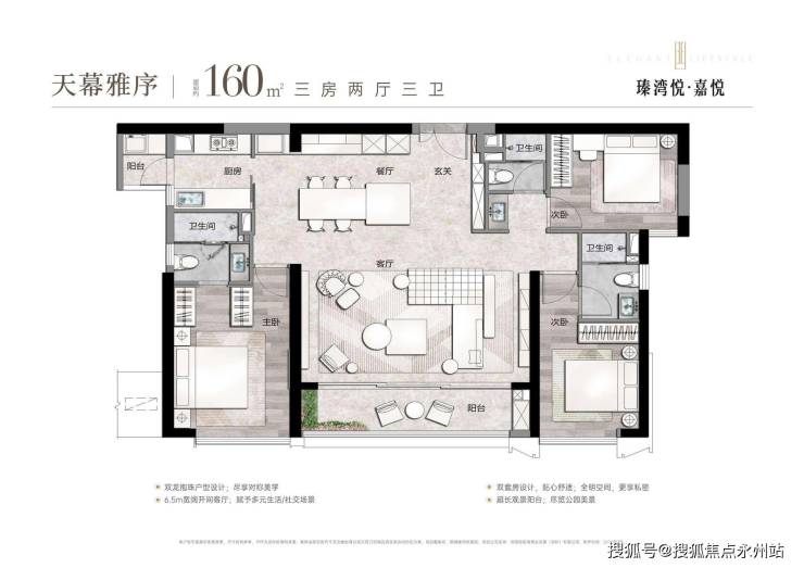 约160㎡3房3卫:专梯入户+独立私梯厅,270°观景面,双套房设计,兼顾隐私与仪式感,适配三口之家或多代同堂